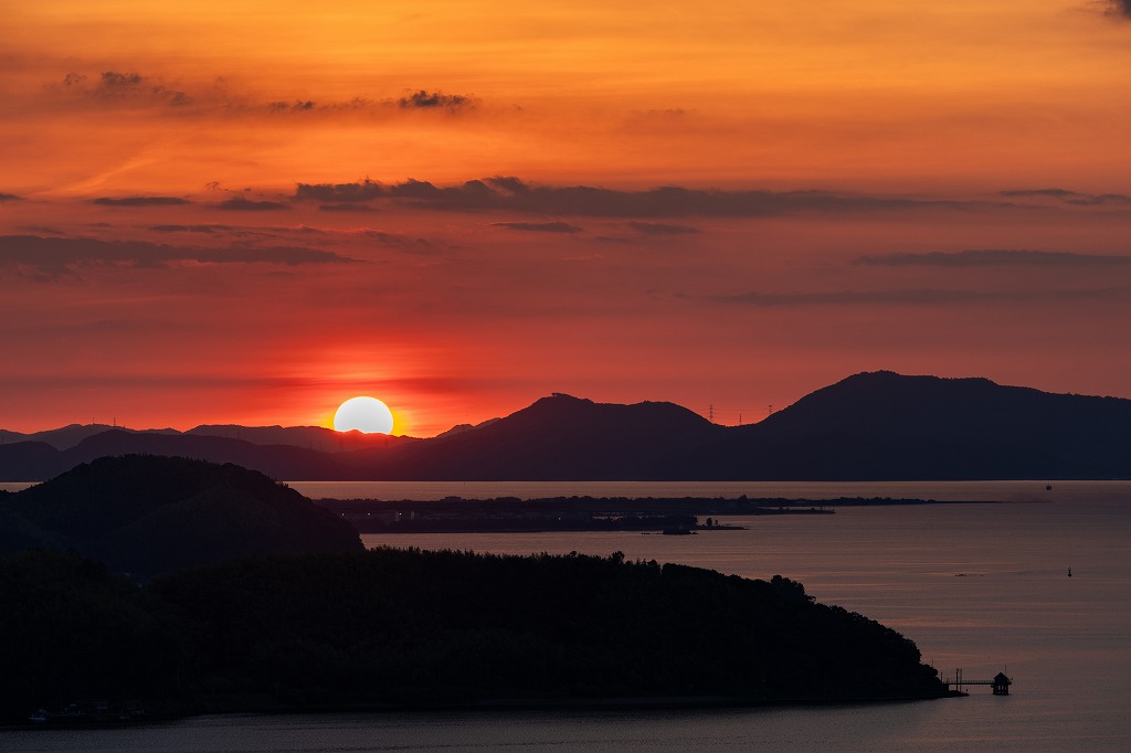 一方、中海はというと、オレンジロードの見頃はもう完全に終わっていて、島根半島に沈む夕日のていであるが、その美しさ、空雲水の夕暮れグラデーションの見事さは格別だ。