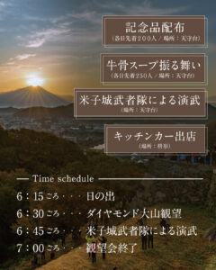 観望会では、米子城武者隊による演武披露、牛骨スープの振る舞い、記念品配布、キッチンカー出店などを予定しています。