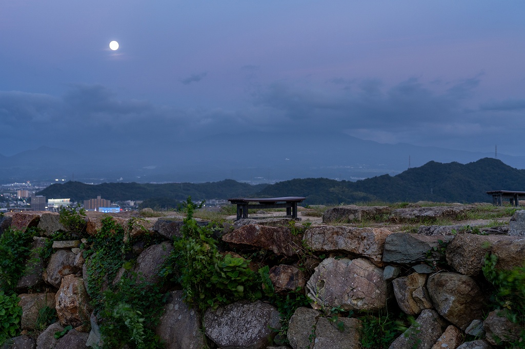 そんなこんなで天候に翻弄され、やきもきしながら迎えた生中継は、少し雲がかかったところがアクセントになってるくらいの素晴らしき名月を拝むことができてひと安心。しばらく居残りで夜景など眺めてから帰ろうと思っていたのだが、相変わらず風が強いので早々に下山。かくして「中秋の名月 in 米子城」は御開きとなったのである。愛でたし目出たし。