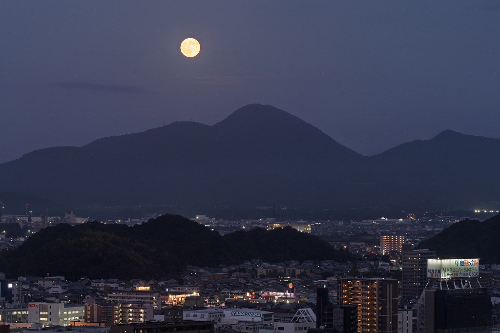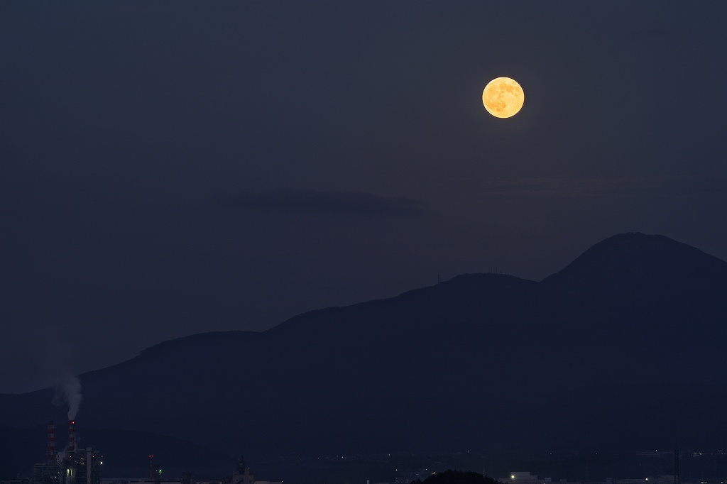 月の出の時刻からしばらく経つと、孝霊山のすぐ上のあたりに見事な満月がぽっかりと浮かんできて、思わず「おおー」と心の快哉が漏れる。まさに読みどおりの展開。この満月をひとり占めできるとは…何とも嬉しいやらもったいないやら。
