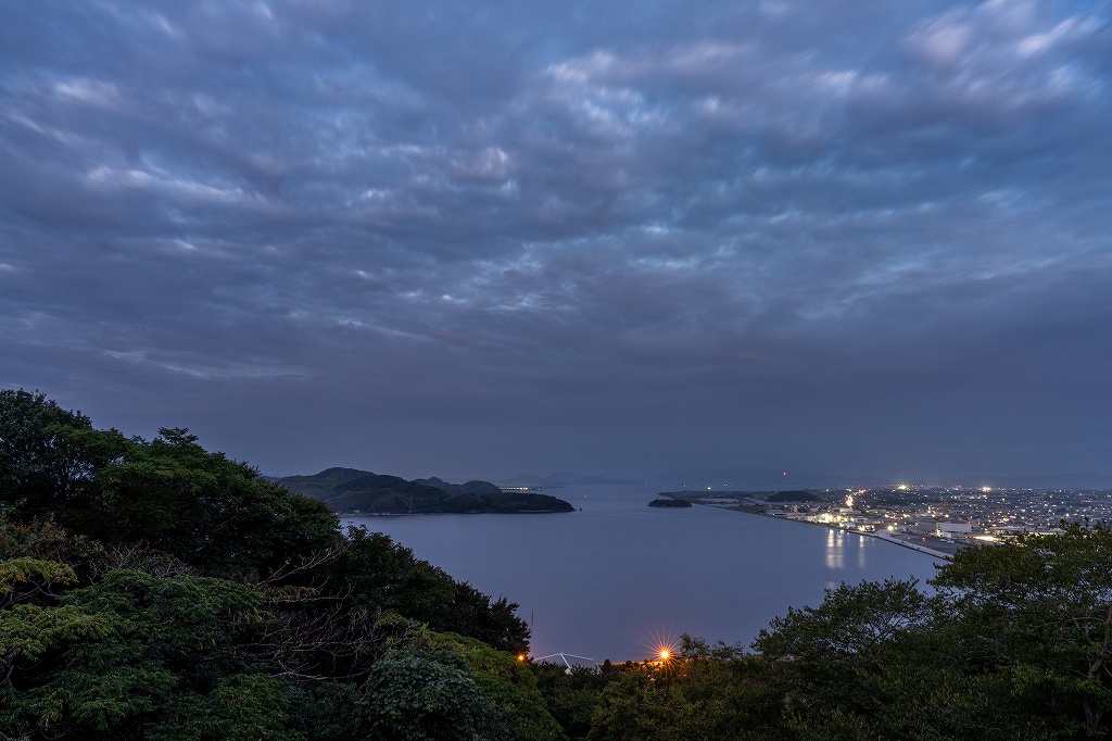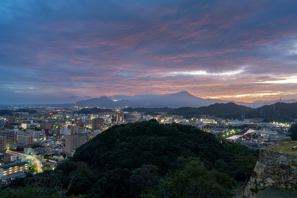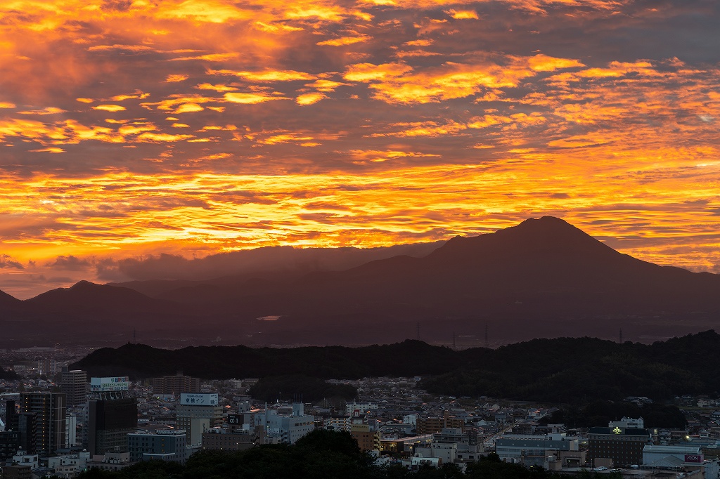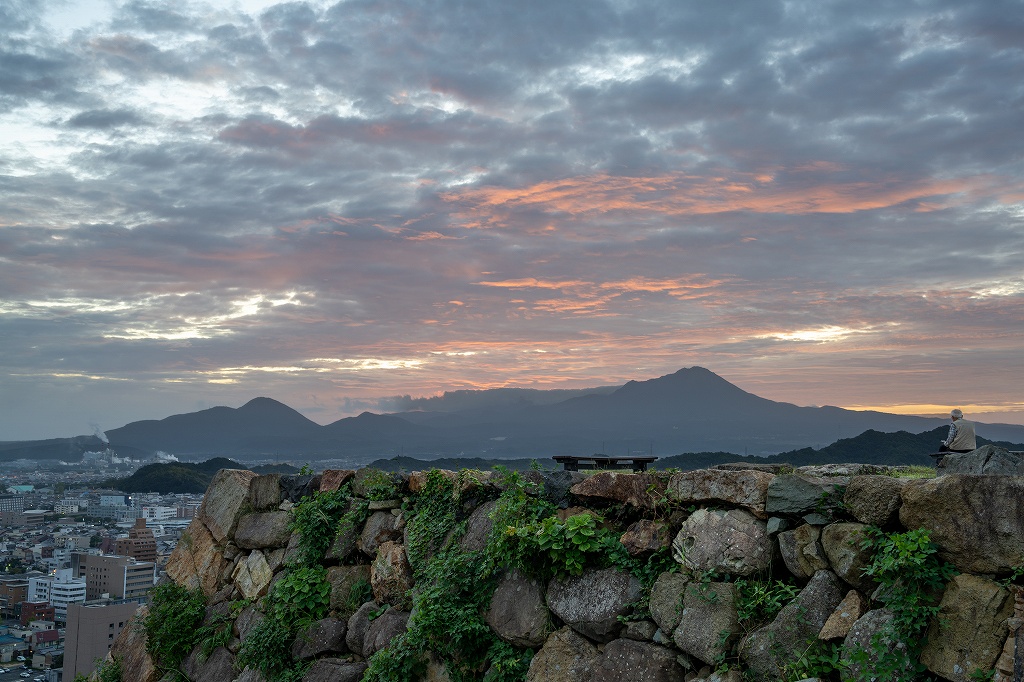 それでまあ、なんとか登城する運びとなったのだが、結局は雲のせいで月の入りを見ることは叶わず。予想どおりとはいえ残念無念!と思っていたところ、やがて日の出に向かってみるみる超焼けの朝。今度は雲のおかげである。そんながっかりびっくりの表裏一体絶景サプライズも「米子城あるある」なのだ。日の出おぢさんも思わずにんまりである。