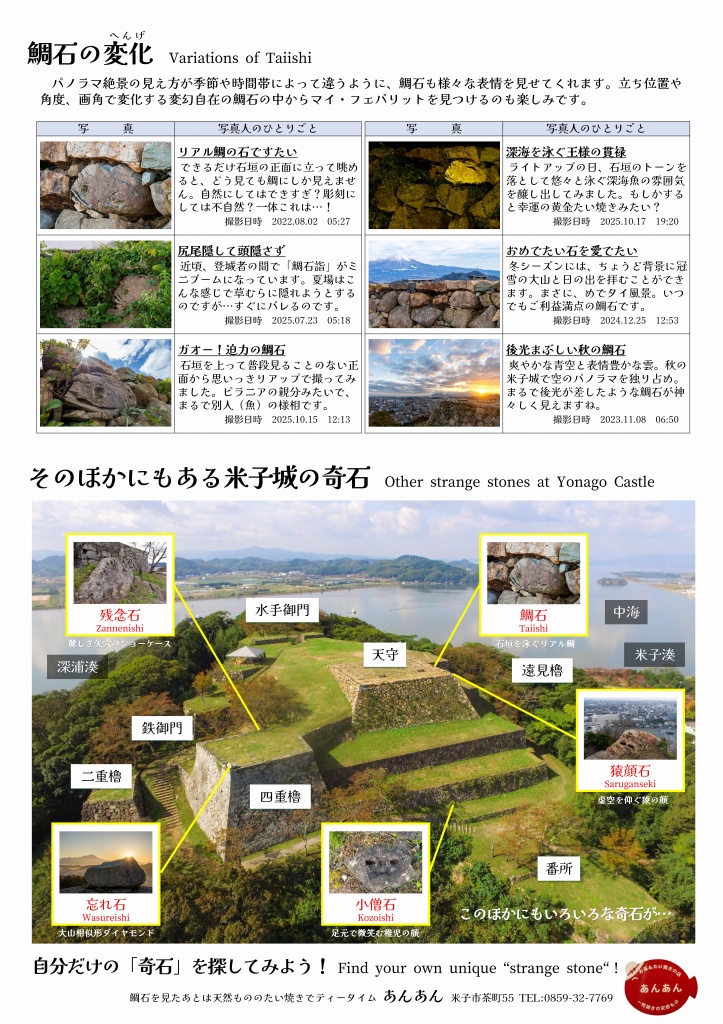 この両輪でじわじわと鯛石の輪を広げ認知度向上を目指し、当面の目標として、気象条件等に左右されない鯛石を目的に登城した人が、思いがけず絶景も楽しめるというハズレのない大おまけ付の観光ツアー商品にしタイのである。