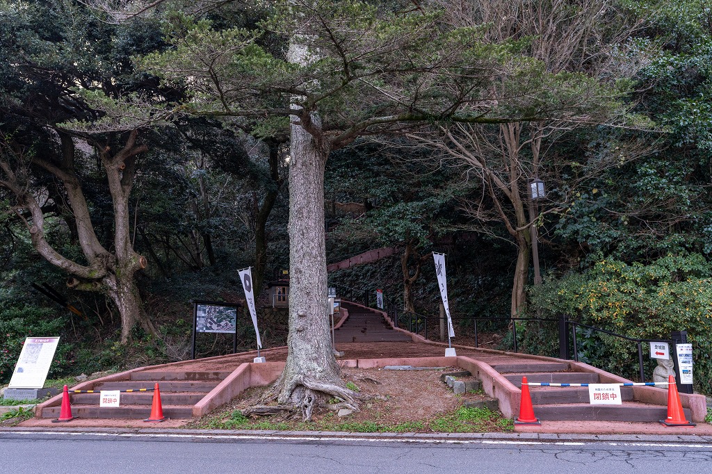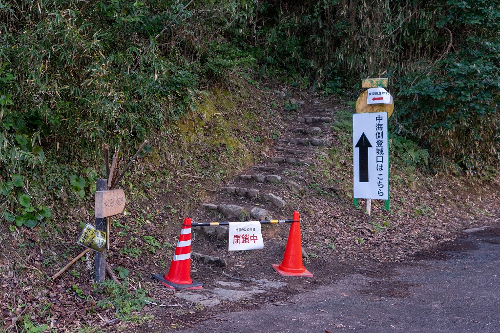1月7日、地震から一夜明けて、とにかく鯛石の安否が気になるので朝イチで確認に向かう。湊山公園駐車場に車を停め、城山周回道路を上がって中海側登城口からの登城を目指す…ところが、なんと「地震のため閉鎖中」の表示が。