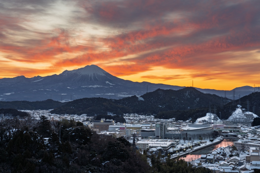 登城路がけっこう凍っているので、足跡などを慎重にトレースしながら番所跡まで来ると、がっつりクリヤーな大山と燃え萌えの朝焼け雲が、本当に「バーン!」という音が聞こえたような気がするくらいセンセーショナルに登場。